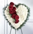 This heart shaped arrangement expresses their grief over a loss. Red roses and white carnations are arranged and placed on an easel for display in a funeral home Dallas, Irving, Arlington, Garland, Mesquite, Plano, Lewisville, Frisco, Wylie, Grapevine, Grand Prairie, Fort Worth, TX