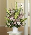 A soft and delicate arrangement of pink snapdragons, green gladiolus, and alstroemeria is a lovely way of paying tribute to a special life