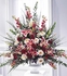 Red roses and pink Stargazer lilies, bright pink snapdragons and Matsumoto asters, are just a few of the lovely blossoms in this extravagant arrangement. Limonium and purple statice with assorted greens serve as accents. Design is one-sided and is appropriate to send to the funeral home or memorial service.