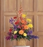 One arrangement with red and yellow carnations, orange gladioli and roses, blue iris and purple stock, is delivered in a square basket.