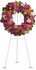 •A standing wreath includes vivid flowers such as green hydrangea, hot pink spray roses, pink gladioli and carnations, lavender and yellow chrysanthemums, all accented by bright greenery
