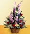 This colorful bouquet conveys your deep sympathies. Traditionally arranged in a basket are red roses, pink gladiolus, white spider chrysanthemums, purple iris and more. Appropriate to send to a residence, funeral home, or memorial service