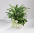 A round bamboo basket holds an assortment of green plants, such as peace lily, philodendron, palm and ivy and is trimmed with a bow. A living expression of your sympathy