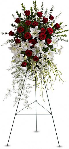 •Red roses, white asiatic lilies and delicate dendrobium orchids are accented with myrtle, sprengeri fern, leatherleaf fern and spiral eucalyptus on a traditional wire funeral easel
