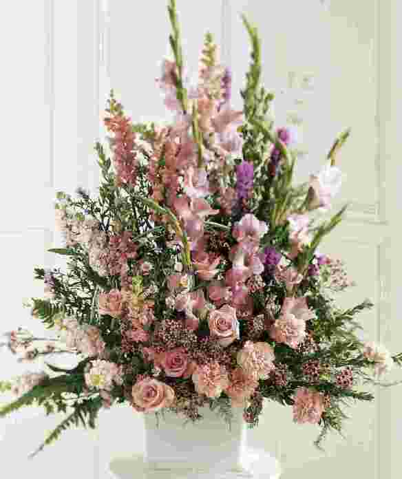 A beautiful sympathy arrangement featuring flowers in many shades of pink. The handled basket holds pink gladiolus, pink roses, pink snapdragons, pink carnations and more. Appropriate to send to a home or to a funeral
