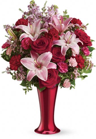 •This romantic bouquet includes pink Asiatic lilies, pink miniature carnations, red carnations, red roses and lavender waxflower accented with assorted greenery. •Delivered in a tapered contemporary ceramic vase coated with a bright red vacuum-metallized finish